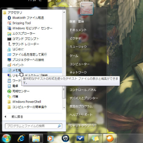 メモ帳は、「スタートメニュー」の「すべてのプログラム」